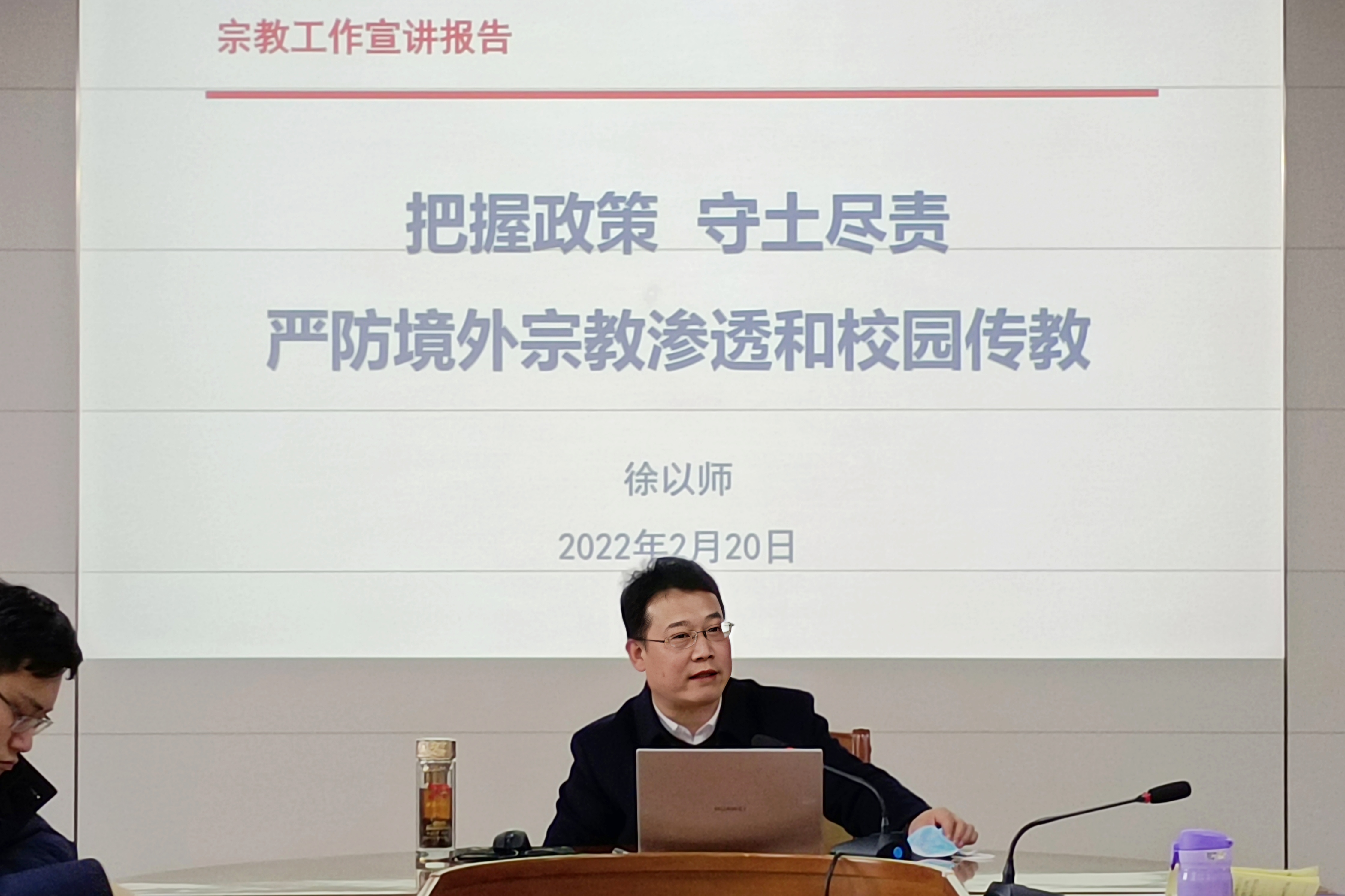 会后,徐以师以“把握政策 守土尽责 严防境外宗教渗透和校园传教”为主题为全体学生干部上开学第一课。