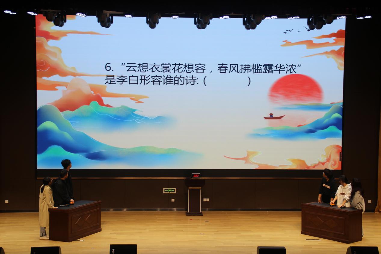 决赛采用现场抽签方式确定团队出场顺序,争夺冠军、亚军和季军的荣誉。比赛分为三轮:第一轮为抢答环节,考查诗歌常识;第二轮为轮流答题,选手需根据随机抽取的意象进行飞花令比拼;第三轮为汉语综合知识抢答,题目难度升级,全面检验选手的综合素质。整场比赛精彩纷呈,各队展现了丰富的诗词储备和极高的文学造诣。此外,活动现场还设置了绕口令和猜诗词的趣味互动环节,吸引了各学院众多诗词爱好者积极参与。