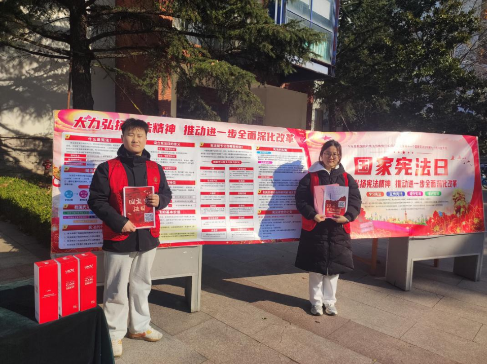 在宪法日当天,学院在城阳校区文经楼前广场张贴宣传日主题海报并摆放宪法主题知识展板,拉起宪法宣传横幅,吸引众多学生驻足观看。在平度校区,学院在思源餐厅门口摆放摊位,开展“宪法知识问答”趣味活动,吸引了大批学生参与。问答活动中,学生们积极参与,认真思考每一道问题,在问答中深化对宪法知识的理解。这一互动环节激发了学生们学习宪法的热情,增强了学生们的法治观念,助力学生们将宪法精神内植于心,外践于行。