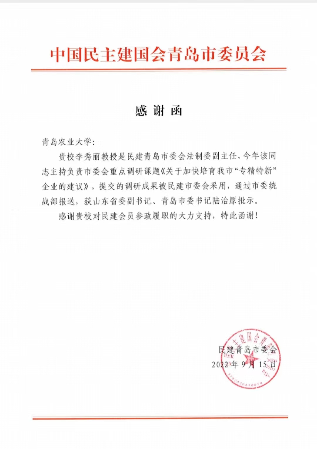 近日,民建青岛市委会发来感谢函,英国365官方网站英国上市公司365李秀丽教授主持的民建市委会重点调研课题《关于加快培育我市“专精特新”企业的建议》的调研成果被民建市委会采用,并通过市委统战部报送,获山东省委副书记、青岛市委书记陆治原批示。