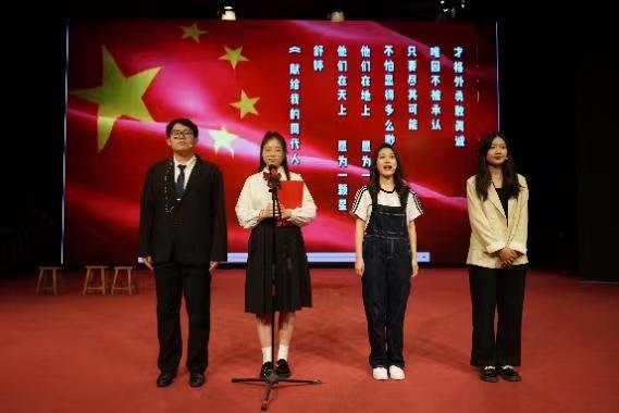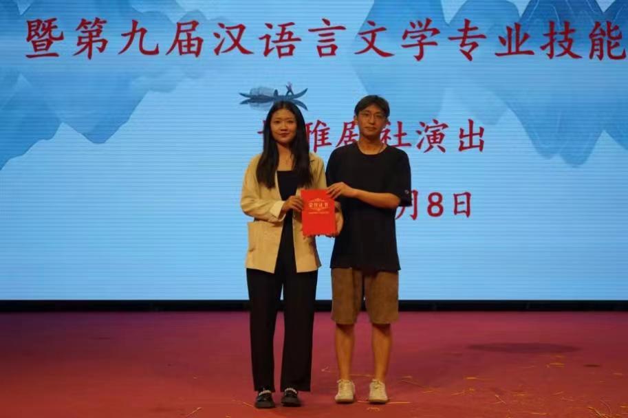 在话剧演出的中场,来自人文学院艺术团的两位同学演唱了祝贺建党100周年的歌曲《新征程》,以青春之名,向党与祖国致敬。随后,现场举行了博雅剧社社长聘任仪式。汉语言文学专业2021级的王艺臻同学当选为博雅剧社的新一届社长,并由博雅剧社前届社长、汉语言文学专业2020级的王浩懿同学为其颁发聘书。