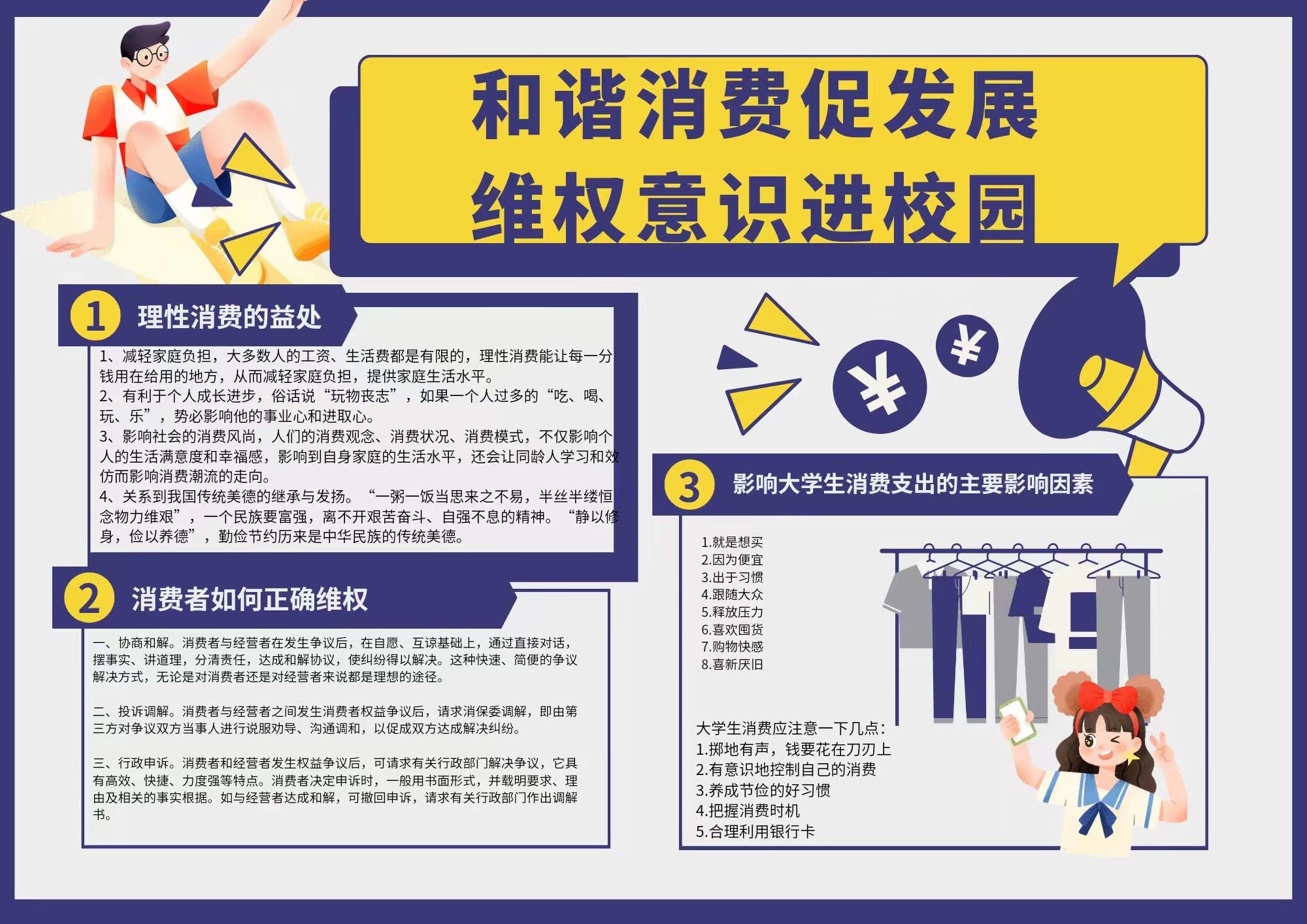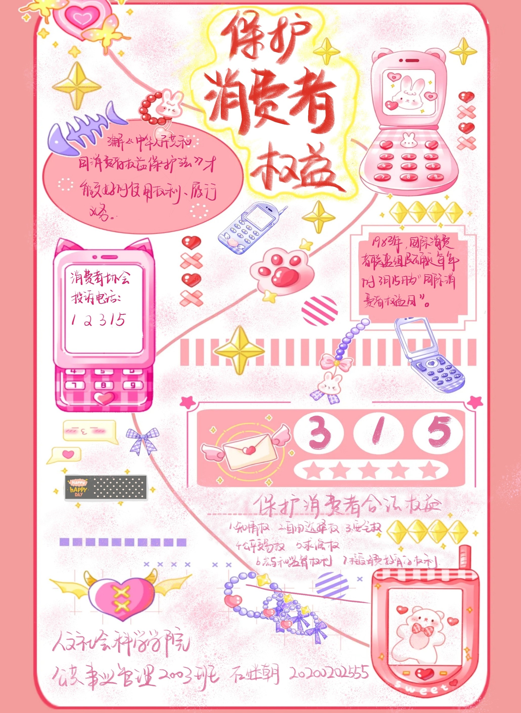 本次活动以手抄报和短视频的形式展开,共有60余名同学参加活动,评选出了六份优秀作品。同学们用绘画、文字和视频表达了自己对“科学消费、合理维权”的认识和对“公平正义,消费和谐”的理解。