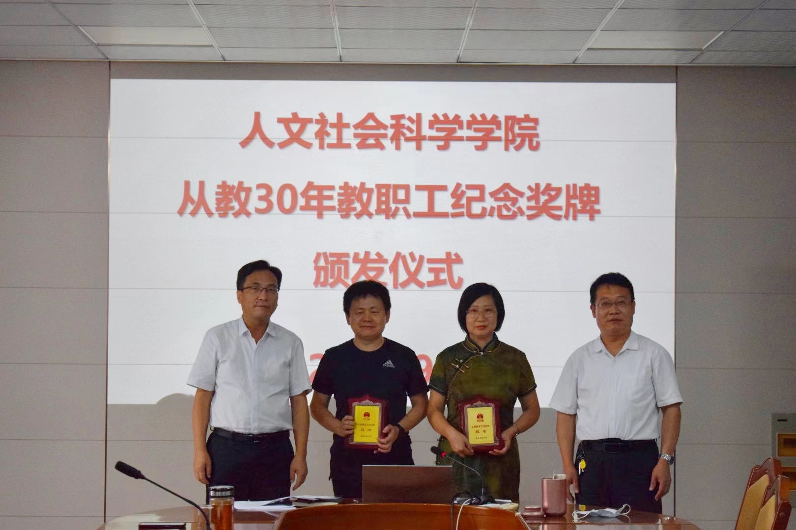 会上,党支书记徐以师和院长云立新为柳清泉、陈建华两位老师颁发从教30年教职工纪念奖牌。